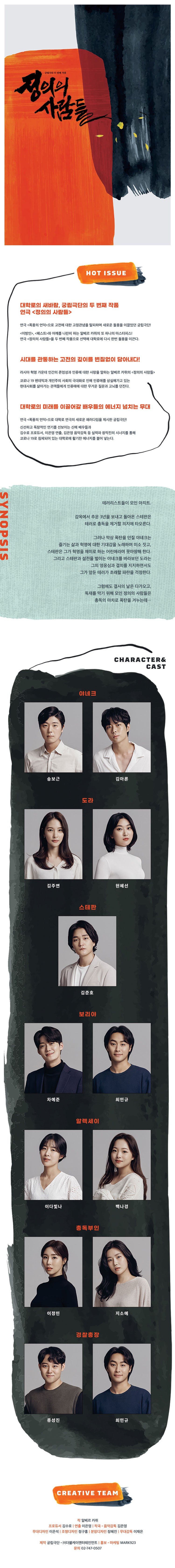 애초 그 많은 대사를 위해 잠깐의 여지를 둘만한 소품을 죄 치운 듯하다. 3년 만에 감옥에서 돌아온 스테판을 두고 술 한 잔을 내밀지 않는 혁명당원이라니! 혁명당원보다는 작가가 그렇듯 토론회에 나온 엘리트 지식인들처럼 보인다. 하여 다른 극장에서 봤던 경험을 떠올린다면 연기력이 받침이 되지 않으면 매우 지루한 시간 지옥이 되고 만다. 좋지 않은 기억을 가지고 있는데다 신생극단인 궁립극단 작품을 본적이 없었으나 프로듀서로 김수로가 나섰다는 데에 일말의 기대를 가지고 본 참이다.