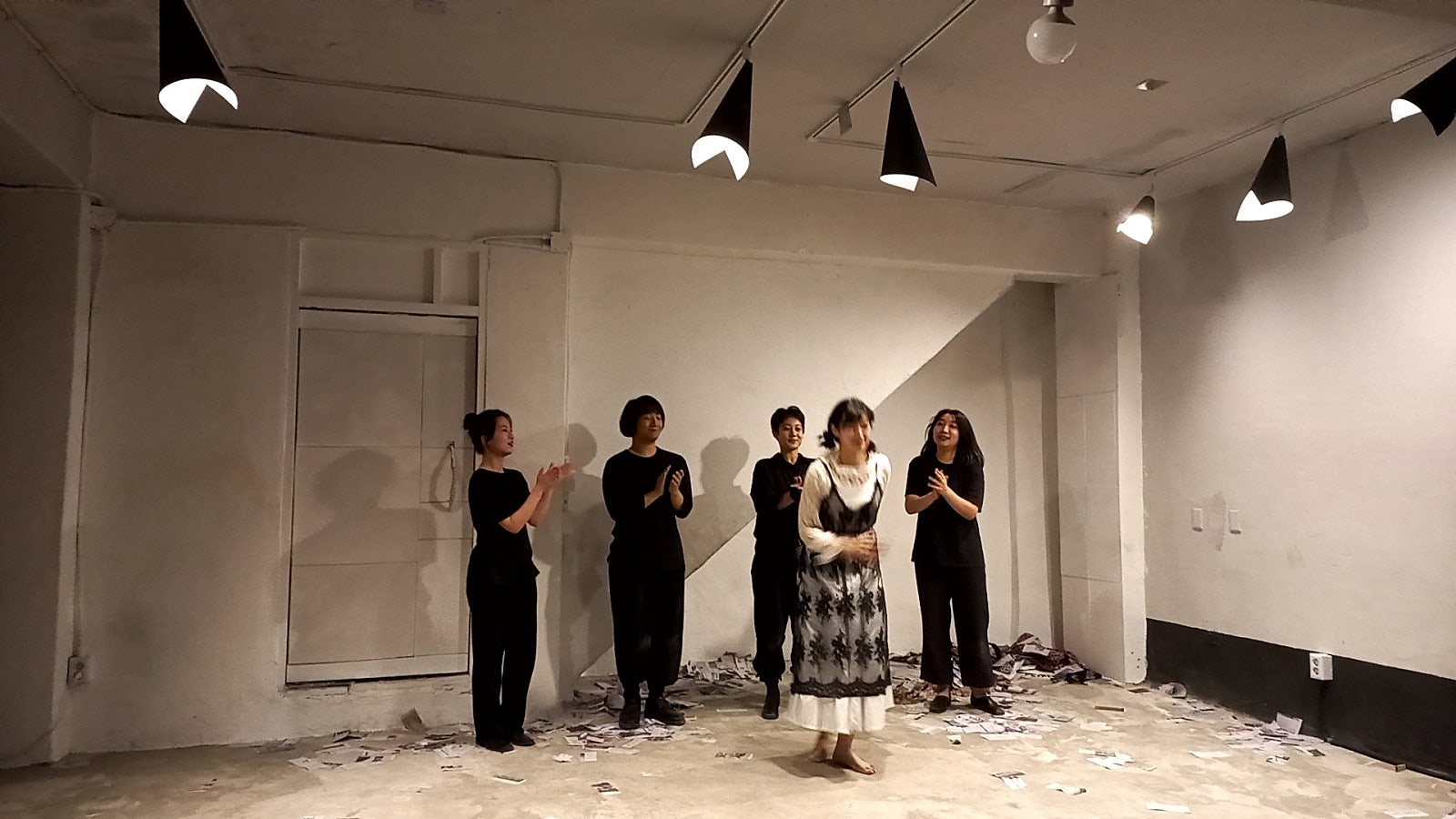 일단 공간부터 보자. 수유역 근처 새로운 연극 공간을 만들었고, 그 공간을 통해 다양한 연극을 실험해보겠다는 의지가 읽히는 이름이다. 이미 익숙한 또 다른 연극실험실이 떠올랐다. 혜화 로터리에 있는 연극실험실 혜화동1번지. 그 공간의 낡음, 좁음, 여러 불편함, 그럼에도 친근하고 새로우면서도 무한히 확장되고 넓어지는 마술이 펼쳐지는 곳. 수유연극실험실도 같은 목적과 의도였을 터, 새로 만들어진 공간은 말 그대로 ‘가난한 연극’의 가난한 공간이었다. 극장 한 벽면에 객석만 놓여있을 뿐, 무대 장치도, 조명 설비도 없는 하얗고 텅 빈 공간은 아무것도 없는 곳에서 연극은 무엇을 어떻게 할 수 있는가에 대한 극한의 실험을 하는 곳으로 보였다. 객석에 앉아 마주 본 곳은 그냥 하얀 바닥과 하얀 벽이 전부. 천장에는 조명기를 움직일 수 있는 레일이 설치되어 있지만, 거기에 매달린 조명은 일명 알전구 14개. 세 개를 뺀 전구는 까만 종이 고깔을 쓰고 있었다. 흔하디 흔한 LED조명 하나 없이 천장의 조명 몇 개와 배우가 손으로 움직이는 스탠드 하나만으로 작품 전체의 조명을 소화해낸 것이 신기할 정도다. (중략)...